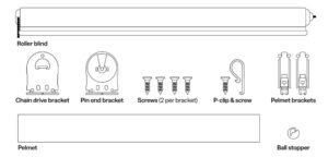 Open up the cardboard box(es) you’ve received. Open the outer layer of plastic surrounding your roller blind(s). You’ll notice some bracket componentry, beaded chains, end caps and a bag of screws. There’ll be one bag with all the screws for each of the blinds you’ve ordered – there are 4 screws per roller blind (2 per bracket).